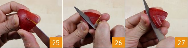 Commencez par la base large et faites une petite incision oblique au centre comme pour former un V inversé (25-26). En laissant quelques millimètres d'espace, faites d'autres incisions toujours en V; répétez l'opération jusqu'à presque atteindre l'extrémité du quartier de pêche 27.