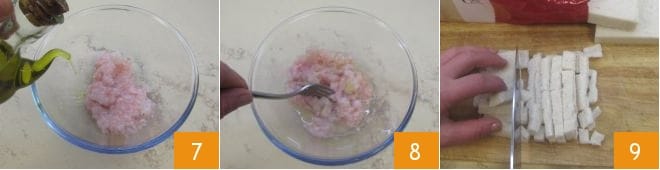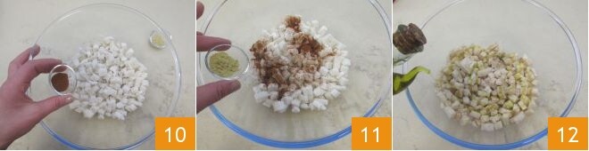 Assaisonnez également avec le sel, le poivre et l'huile 7. Mélangez 8 et laissez mariner au moins 30 minutes au réfrigérateur. Pendant ce temps, coupez en petits dés le pain de mie 9.