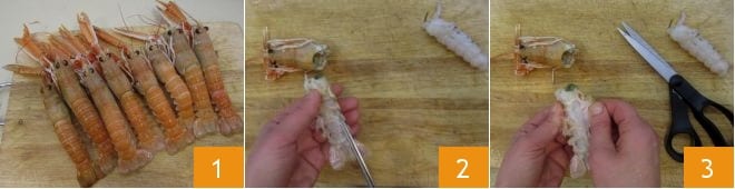 Pour préparer la tartine en verre, commencez par la tartare de langoustines : prenez les langoustines 1, coupez la tête avec des ciseaux et ouvrez la carapace pour l'extraire (2-3), puis retirez le filament intérieur (l'intestin) en le tirant avec un couteau bien aiguisé.