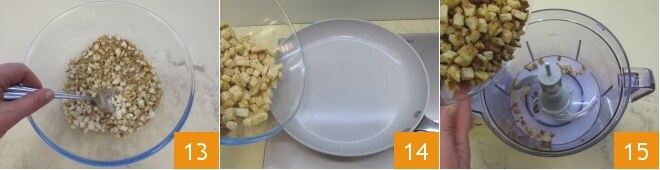 mélangez le tout 13 et versez dans une poêle antiadhésive 14 pendant au moins 10 minutes jusqu'à ce que tout devienne croustillant. Une fois doré, versez-le dans un mixeur 15 et mixez pour obtenir un crumble.
