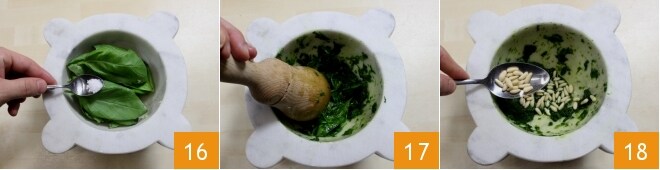 Enfin, préparez le pesto : dans un mortier (ou un mixeur), mettez l'ail épluché, les feuilles de basilic nettoyées avec un chiffon sec et le sel 16. Commencez à piler 17, écrasez ensuite le basilic contre les parois du mortier en tournant le pilon de gauche à droite et en tournant simultanément le mortier dans le sens inverse (de droite à gauche). Continuez ainsi jusqu'à ce qu'un liquide vert brillant sorte des feuilles de basilic 8, à ce moment-là ajoutez les pignons de pin 18 et recommencez à piler pour réduire en crème. Ajoutez les fromages peu à peu, en mélangeant continuellement, ce qui rendra la sauce encore plus crémeuse, et enfin l'huile d'olive extra vierge qui devra être versée en filet, en mélangeant toujours avec le pilon. Mélangez bien les ingrédients jusqu'à obtenir une sauce homogène.