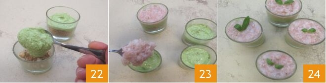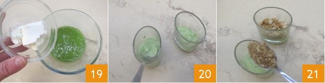 Incorporez à la crème obtenue, la robiola 19, mélangez le tout et prenez 6 verrines de 80 g de capacité. Commencez à les composer avec une couche de pesto 20, une de pain de mie toasté 21,