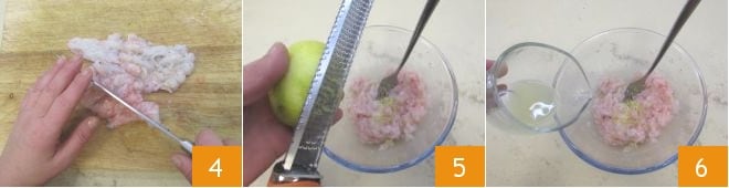 Hachez finement les langoustines avec le couteau 4 puis mettez-les dans un bol et râpez le zeste de citron 5, puis pressez-en le jus, filtrez-le et répartissez-le sur le poisson 6.