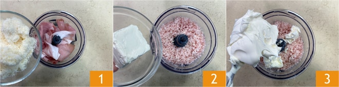 Pour préparer les truffes salées Arlequin, commencez par mettre le jambon cuit dans un mixeur, ajoutez le Parmigiano 1 et mixez. Ajoutez le fromage frais 2 et le fromage à tartiner 3, puis mixez jusqu'à obtenir un mélange homogène. Transférez le tout dans un bol.