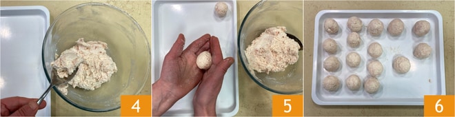 Prélevez une cuillère de mélange 4 et formez une boule 5. Continuez jusqu'à épuisement du mélange ; avec ces quantités, vous obtiendrez environ 16 truffes. Disposez-les au fur et à mesure sur un plateau 6.