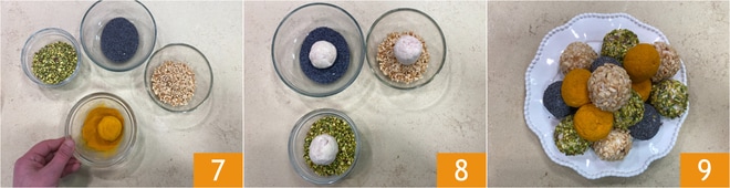 Versez le curcuma, les graines de pavot, le granola de pistaches et celui de noisettes dans des petits bols séparés, puis enrobez les truffes avec les différentes panures 7 8. Vos truffes salées Arlequin sont prêtes à être servies 9 !