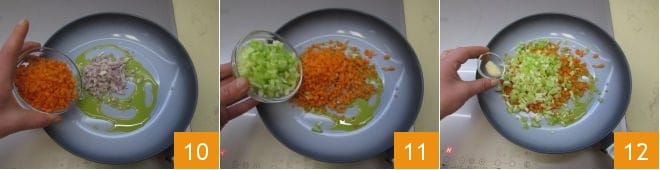 Dans une poêle antiadhésive, versez l'huile et ajoutez le hachis de carottes 10, d'échalote, de céleri 11 et l'ail 12.