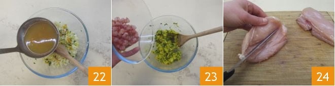 versez encore 30 grammes de bouillon 22 ; ajustez le sel et le poivre. Ajoutez ensuite au mélange les crevettes crues restantes coupées en petits morceaux 23 et mélangez bien : ce mélange sera la farce de vos poches de poulet. Passez maintenant à la préparation des poitrines de poulet : incisez la poitrine de poulet en suivant la ligne horizontale naturelle qui traverse le centre sans la couper complètement, obtenant ainsi une poche 24.