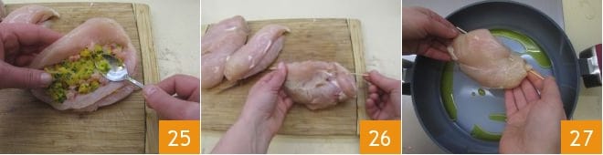 Remplissez les poitrines avec la farce que vous avez obtenue non mixée 25 et scellez vos poches avec de longs cure-dents pour que le mélange intérieur ne déborde pas 26. Ensuite, prenez une poêle et versez-y de l'huile en filet. Déposez-y les poches de poulet et faites-les dorer sur les deux côtés 27.