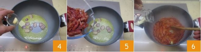 Ajoutez ensuite le thym 13 et laissez dorer tous les ingrédients pendant environ 6-7 minutes. Lorsqu'ils sont bien dorés, ajoutez les crevettes en morceaux (réservez environ 80 grammes) 14 et laissez cuire pendant quelques minutes ; ajoutez environ 50-60 grammes du bouillon de poisson que vous avez préparé 15.