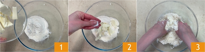 Pour préparer la tatin aux fenouils, commencez par la pâte brisée : dans un saladier, mélangez la farine et le beurre froid 1, ajoutez le sel 2 et travaillez du bout des doigts jusqu'à obtenir un mélange sableux 3.