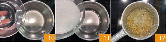 Passez au caramel : dans une petite casserole, versez l'eau 10 et le sucre 11 et chauffez à feu moyen 12.