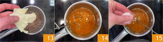 Quand le caramel aura pris une couleur ambrée, ajoutez le beurre 13 et mélangez avec un fouet, juste le temps de l'incorporer 14. Enfin, ajoutez le sel 15 et retirez du feu.