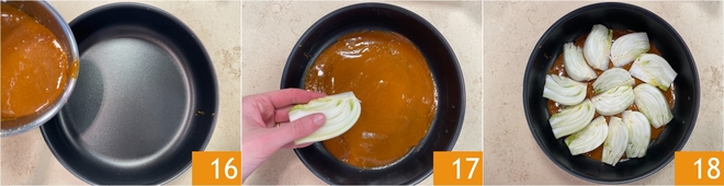 Prenez maintenant un moule antiadhésif de 26 cm de diamètre (mieux vaut le préchauffer légèrement au four) et versez-y le caramel 16. Répartissez-le pour couvrir toute la base, puis disposez les quartiers de fenouil 17 de façon à former une rosace 18.