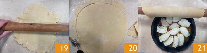 À ce stade, reprenez la pâte brisée et étalez-la au rouleau jusqu'à une épaisseur de 7 mm, en vous aidant d'une pincée de farine 19. Découpez un disque d'un diamètre légèrement supérieur à celui du moule 20. Enroulez la pâte autour du rouleau et déroulez-la sur le moule 21.