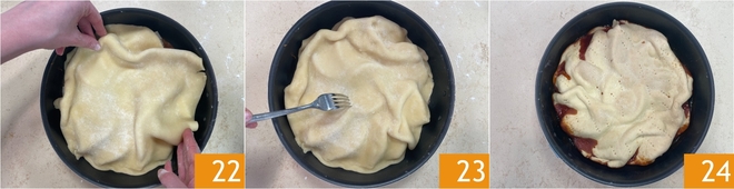 Faites bien adhérer la pâte le long des bords et autour des fenouils, afin d'obtenir les plis classiques 22. Piquez la pâte avec une fourchette 23 et faites cuire dans un four statique préchauffé à 180° pendant environ 40 minutes 24.