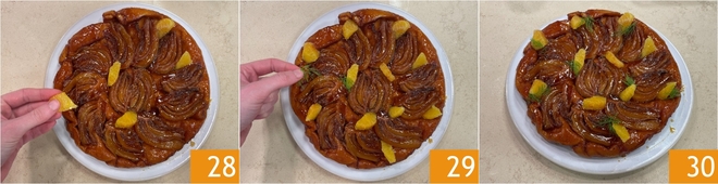 Au terme de la cuisson, sortez-la du four et laissez tiédir une dizaine de minutes. Pendant ce temps, préparez les suprêmes d'orange : retirez la peau avec un petit couteau dentelé 25 et prélevez les suprêmes en coupant la chair entre deux membranes 26. Enfin, coupez les suprêmes en deux. Une fois tiédie, retournez la tatin sur un plat de service 27.
