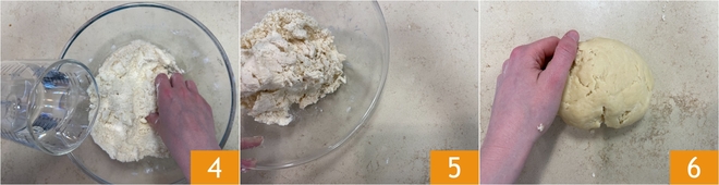 Versez l'eau froide 4 et continuez à pétrir à la main, d'abord dans le bol puis sur le plan de travail 5. Lorsque vous aurez formé une boule lisse et homogène 6, enveloppez-la dans du film alimentaire et placez-la au réfrigérateur pendant que vous poursuivez le reste de la recette.