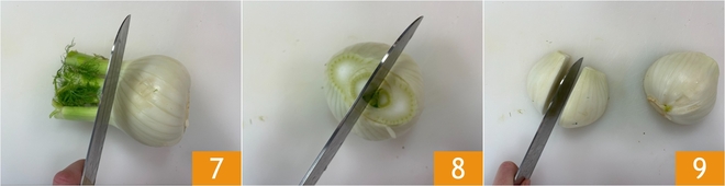 Occupez-vous des fenouils : enlevez les extrémités 7, coupez-les en deux 8 puis tranchez-les en quartiers 9. Réservez-les.