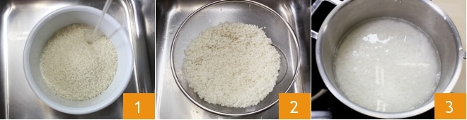 Pour faire le temaki de saumon, vous devez d'abord préparer le riz, en utilisant du riz adapté au sushi avec des grains ronds et petits. Rincez le riz sous l'eau courante froide 1, au moins 5-6 fois, en le remuant avec les mains : l'eau doit devenir claire. Ensuite, laissez-le tremper pendant au moins 15 minutes. Après égouttez-le 2 et laissez-le reposer pendant un autre quart d'heure. Puis versez le riz dans une casserole large mais pas trop grande et couvrez-le d'eau 3