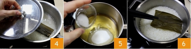 Vous pouvez aromatiser avec un morceau d'algue nobu si vous préférez, puis couvrez avec un couvercle 4 et portez à ébullition en cuisant à feu moyen, sans jamais découvrir la casserole. Entre-temps, préparez l'assaisonnement : versez le vinaigre de riz dans une petite casserole et ajoutez le sucre et le sel 5. Allumez à feu doux et chauffez le tout pour dissoudre le sucre, sans porter à ébullition. Quand il sera chauffé et que le sel et le sucre seront dissous, éteignez et laissez refroidir. Pendant ce temps, préparez l'hangiri, le récipient en bois dans lequel le riz reposera (vous pouvez utiliser à la place un récipient bas et large non métallique) : rincez-le à l'eau froide et séchez-le bien avec un torchon propre. Dès que l'eau du riz arrive à ébullition, laissez bouillir pendant 5 minutes, puis retirez l'algue avec une pince 6, recouvrez à nouveau avec le couvercle, réduisez le feu et cuisez ainsi pendant encore 8-10 minutes. Éteignez le feu et laissez reposer avec le couvercle pendant environ 10 minutes.