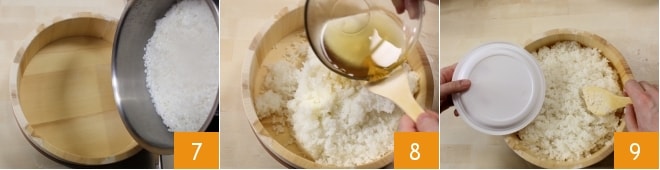 Puis transférez le riz dans le récipient en bois 7, puis arrosez-le avec l'assaisonnement à base de vinaigre, en le faisant couler avec une spatule plate et arrondie afin de le répartir uniformément 8. Remuez ensuite le riz avec la spatule en éventant avec une assiette en plastique pour le refroidir et faire évaporer le vinaigre 9. Une fois refroidi à température ambiante