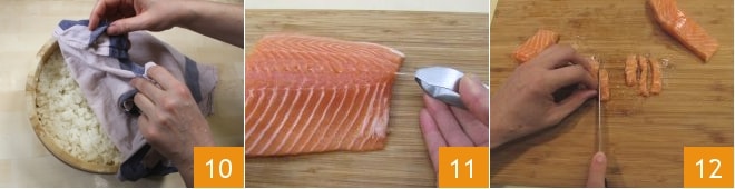 couvrez-le avec un torchon propre humidifié à l'eau froide 10 et laissez reposer jusqu'au moment de l'utilisation. Prenez ensuite le saumon norvégien. Si vous utilisez du saumon norvégien, il ne sera pas nécessaire de le traiter avant de le consommer, sinon assurez-vous d'acheter un filet déjà congelé, sinon pour plus de sécurité, vous pouvez le congeler pendant une semaine dans le congélateur de la maison avant de le déguster cru. Retirez les arêtes présentes avec une pince de cuisine 11 et éliminez la peau si présente avec un couteau à lame aiguisée. Ensuite, réduisez le saumon en lanières 12