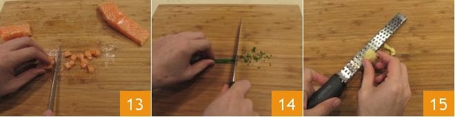 puis en dés 13; ensuite émincez les brins de ciboulette 14 et mettez-les de côté; pelez puis râpez le gingembre frais 15.