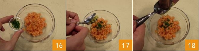 Dans un petit bol, versez le saumon, la ciboulette 16 et pressez le jus du gingembre frais en plaçant la pulpe râpée entre deux cuillères (17-18). Assaisonnez avec du sel et du poivre, mélangez et laissez mariner quelques minutes le saumon.