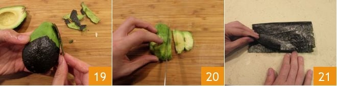 Pendant ce temps, nettoyez l'avocat : coupez-le en deux, retirez le noyau central et épluchez-le 19; puis réduisez la pulpe en tranches 20. Coupez en deux une feuille d'algue nori 21