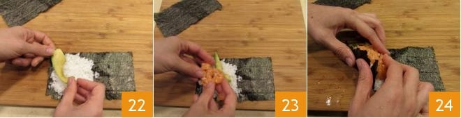 et placez sur la moitié de la feuille un peu de riz, quelques tranches d'avocat 22 et les dés de saumon assaisonnés 23. Maintenant passez au roulage pour créer votre temaki de saumon : pliez l'angle en bas à votre gauche vers la partie en haut à droite de l'algue nori, pour couvrir la garniture 24.