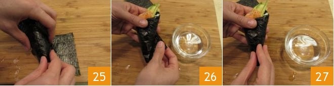 Roulez jusqu'à la fin de la nori, en créant un petit cône de manière à ce que la garniture soit visible 25; vous pouvez vous aider dans cette opération avec un petit bol d'eau froide pour vous humidifier les mains et mieux travailler le cône d'algue. Fermez l'angle de l'algue nori sur la partie finale du cône, et humidifiez-le davantage pour le sceller (26-27).
