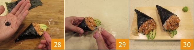 Enrichissez les cônes avec des graines de sésame noires et blanches (28-29); ensuite servez vos temakis au saumon avec du wasabi et des pétales de gingembre en saumure 30 !