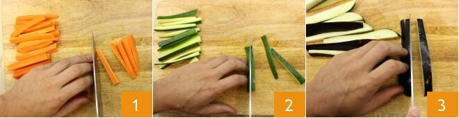 Pour réaliser la tempura de calamars et légumes, placez l'eau gazeuse au congélateur. Pendant ce temps, lavez et coupez en juliennes les carottes 1, les courgettes 2, les aubergines 3,