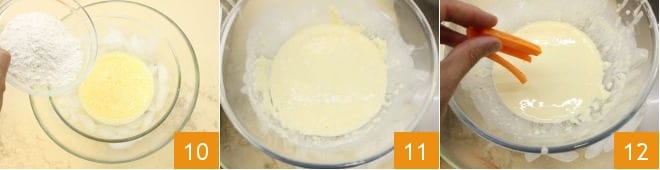 ) et la farine tamisée 10, mélangez rapidement, pas trop longtemps (peu importe s'il y a de petits grumeaux de farine) ; la pâte ne doit pas être collante. Faites chauffer un wok avec une grande quantité d'huile végétale 11 et lorsque la température de l'huile atteindra 180°, vous pourrez procéder à la cuisson (surveillez la température avec un thermomètre alimentaire). Immergez les légumes 12 dans la pâte de manière à ce qu'ils soient complètement enrobés,