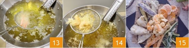 puis faites-les frire dans l'huile chaude 13 le temps nécessaire pour dorer la pâte (qui ne doit pas trop foncer, puis égouttez les légumes avec une écumoire et laissez-les sécher sur un plateau recouvert de papier absorbant. Continuez ensuite avec les calamars et les crevettes 14. Ne faites pas frire trop d'ingrédients ensemble, l'huile se refroidirait rapidement. Servez immédiatement la tempura de calamars et légumes 15.