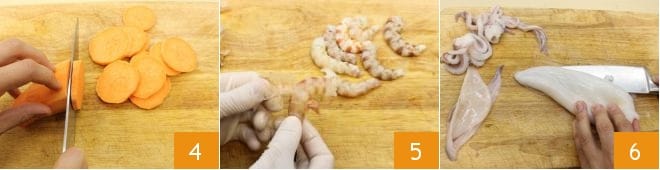 ), pelez et coupez en rondelles fines la patate douce 4. Nettoyez les crevettes : enlevez la tête, la carapace 5, extrayez l'intestin et mettez-les de côté. Nettoyez les calamars : détachez la tête, extrayez les entrailles, enlevez la peau et les nageoires puis rincez-les sous l'eau courante. Incisez d'un couteau un côté des calamars pour les ouvrir 6