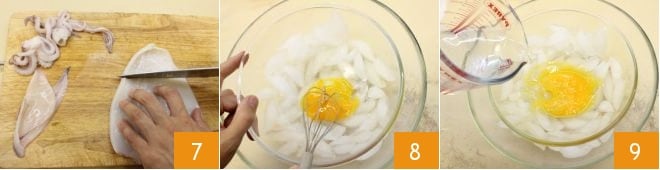 découpez des morceaux de 3-4 cm de large 7 et mettez-les de côté. Prenez un bol et remplissez-le de glace, posez un autre bol qui puisse le contenir dessus, battez le jaune d'œuf avec un fouet 8, puis versez l'eau gazeuse glacée 9