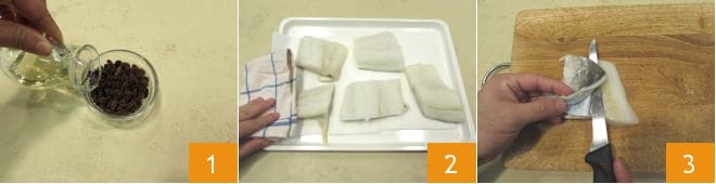 Pour préparer la terrine de cabillaud avec sauce aux pommes, commencez par rincer les raisins secs sous l'eau courante, puis mettez-les à réhydrater dans un petit bol avec le vin blanc 1 : laissez ainsi pendant au moins 30 minutes. Ensuite, prenez le cabillaud dessalé (si vous possédez du cabillaud salé, suivez notre école de cuisine : Comment dessaler la morue) et passez-le rapidement sous un filet d'eau froide : puis tamponnez-le bien 2. Retirez la peau du poisson avec la lame d'un couteau bien aiguisé 3,