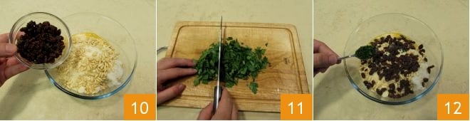 Ajoutez les raisins secs aux autres ingrédients 10. Hachez finement le persil bien rincé et séché 11 et ajoutez-le également dans le petit bol 12.