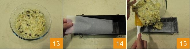 Mélangez bien les ingrédients avec une fourchette afin d'obtenir un mélange homogène 13. Maintenant, beurrez un moule à cake de 27x10 cm et haut de 7 cm et chemisez-le de papier sulfurisé 14 : vous pouvez découper des bandes de papier sulfurisé de l'épaisseur et de la longueur du fond et du côté du moule, de manière à ne pas laisser d'espace découvert. Transférez le mélange obtenu 15, en l'aplanissant avec une spatule.