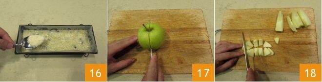 Poudrez avec le fromage râpé 16 et enfournez dans un four statique préchauffé à 170°C pendant 50-55 minutes (si vous utilisez un four à chaleur tournante, il suffira de 150°C pour 40-45 minutes). Pendant que la terrine de cabillaud est au four, préparez la sauce aux pommes : coupez-les en deux 17 et épluchez-les. Coupez-les en quartiers puis en dés 18.