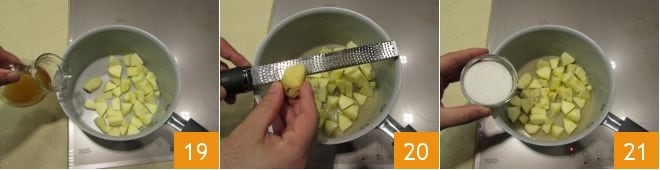 Versez-les dans une casserole antiadhésive et ajoutez le vin blanc que vous aviez utilisé pour faire tremper les raisins secs 19 : laissez le tout réduire à feu moyen. Lorsque le vin aura évaporé, épluchez le gingembre avec un épluche-légumes et râpez-en le zeste directement dans la casserole 20. Faites cuire à feu modéré pendant quelques minutes, puis ajoutez le sucre 21.