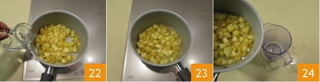 Ajoutez également l'eau et laissez cuire pendant environ quelques minutes jusqu'à ce que l'eau soit presque totalement absorbée 23. Continuez à mélanger pour amalgamer les ingrédients et les saveurs. Les pommes à la fin de la cuisson doivent être bien cuites et très tendres. Transférez-les ensuite dans un récipient étroit et haut 24.