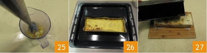 Mixez-les avec un mixeur plongeant 25 et votre sauce aux pommes sera prête. Entre-temps, la terrine de cabillaud sera également prête (vous pouvez effectuer le test de cuisson avec un cure-dents) 26 : démoulez-la en la retournant sur un plat de service 27, en prenant soin de détacher délicatement également le papier sulfurisé.