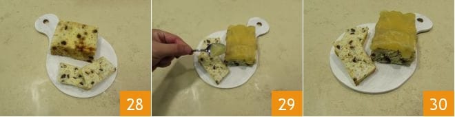 Vous pouvez décider de servir la terrine de cabillaud en en coupant quelques tranches 28 et en déposant sur elles et sur la terrine elle-même la sauce aux pommes 29. Votre cabillaud avec sauce aux pommes est maintenant prêt à être servi et dégusté 30 !