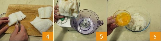 enlevez les arêtes 4 à l'aide de pinces de cuisine et versez-le dans le mixeur 5 pour le mixer. Transférez le cabillaud émietté dans un grand bol auquel vous ajouterez les jaunes d'œufs battus 6.