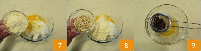 Ajoutez également le fromage râpé 7 et les pignons de pin 8. Ensuite, égouttez les raisins secs et réservez le vin 9.