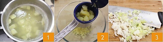 Pour préparer la terrine mille-saveurs, épluchez et coupez grossièrement les pommes de terre, puis faites-les cuire dans une grande quantité d'eau salée pendant environ 15 minutes 1. Passez-les dans un presse-purée (ou moulin à légumes) en laissant tomber la purée directement dans un bol, puis laissez-la tiédir 2. Nettoyez, lavez et émincez finement l'oignon nouveau 3, puis faites-le revenir, avec un peu d'huile, à feu doux pendant au moins 15 minutes.