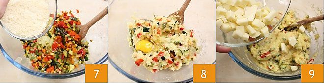 Ajoutez le Grana Padano AOP râpé 7, en réservant un peu pour la fin, les œufs 8, la mozzarella coupée en dés 9, une pincée de sel et une pincée de poivre,